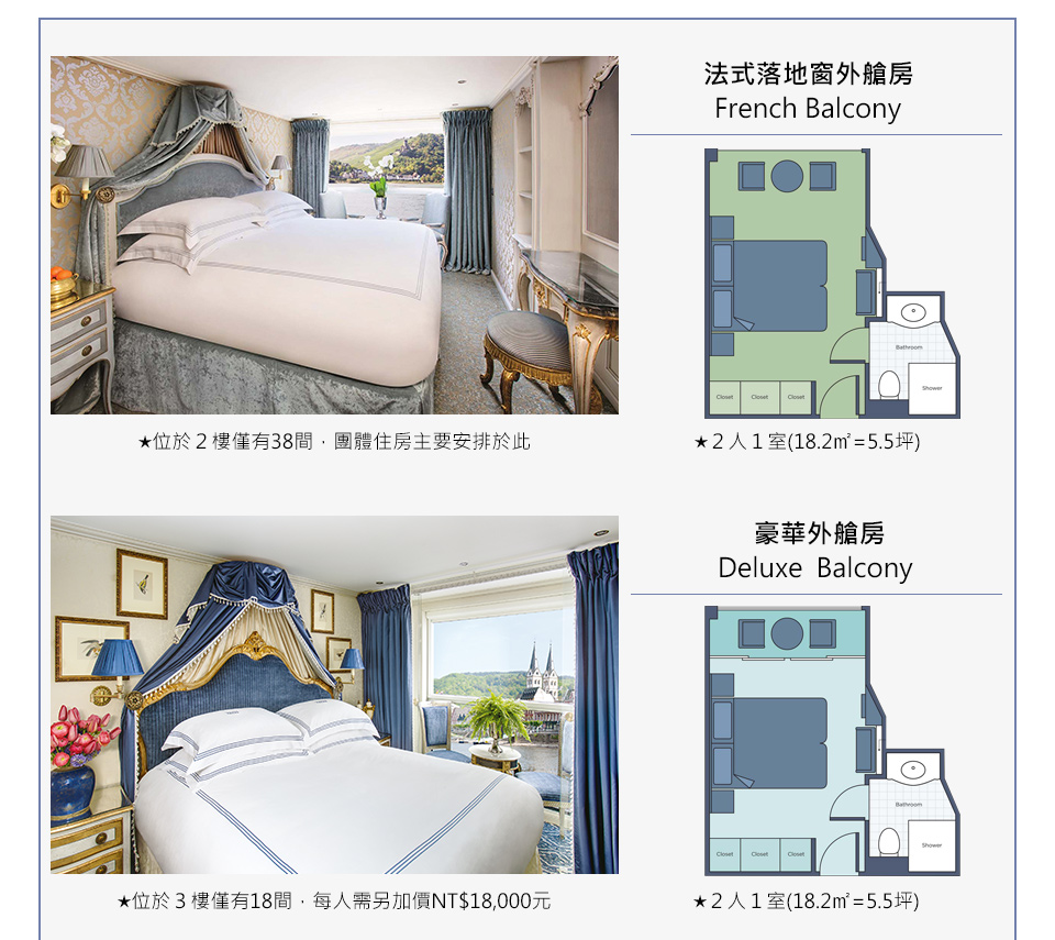 ※欲改訂3樓【豪華外艙房】Deluxe Balcony (18.2㎡),每人需另加價NT$18,000元。(*只有18間)