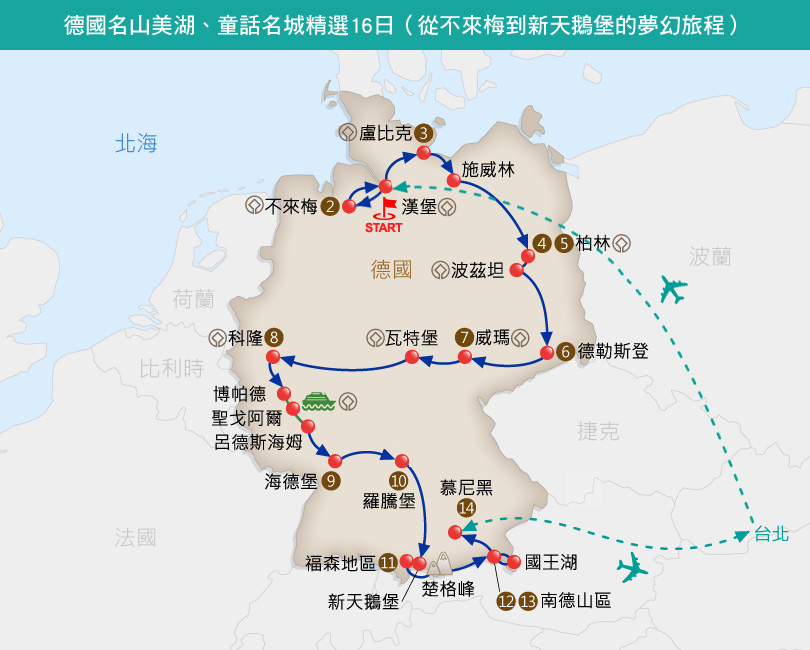 理想旅遊行程列印-德國名山美湖、童話名城精選16日(不來梅到新天鵝堡夢幻旅程)一趟深入德國的夢幻童話旅程!16日精選之旅,我們將從格林童話大道的起點不來梅出發,探訪羅騰堡的中世紀風情,並親臨迪士尼城堡原型—新天鵝堡。行程更將帶您登上德國第一高峰楚格峰,船遊仙境國王湖與浪漫的萊茵河谷,在柏林與慕尼黑感受帝國的輝煌。