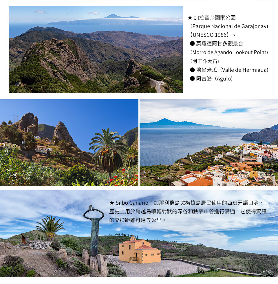 參觀世界遺產★加拉霍奈國家公園 ( Parque Nacional de Garajonay )【UNESCO 1986】,加拉霍奈及其傳奇的月桂樹森林。數百萬年前大量生長的月桂樹現在已經很少見了,而且僅在世界上的少數地方被發現。其中一個地方位於加那利群島,尤其是受保護的 4,000 公頃加拉霍奈國家公園,這裡是大自然的統治之地。