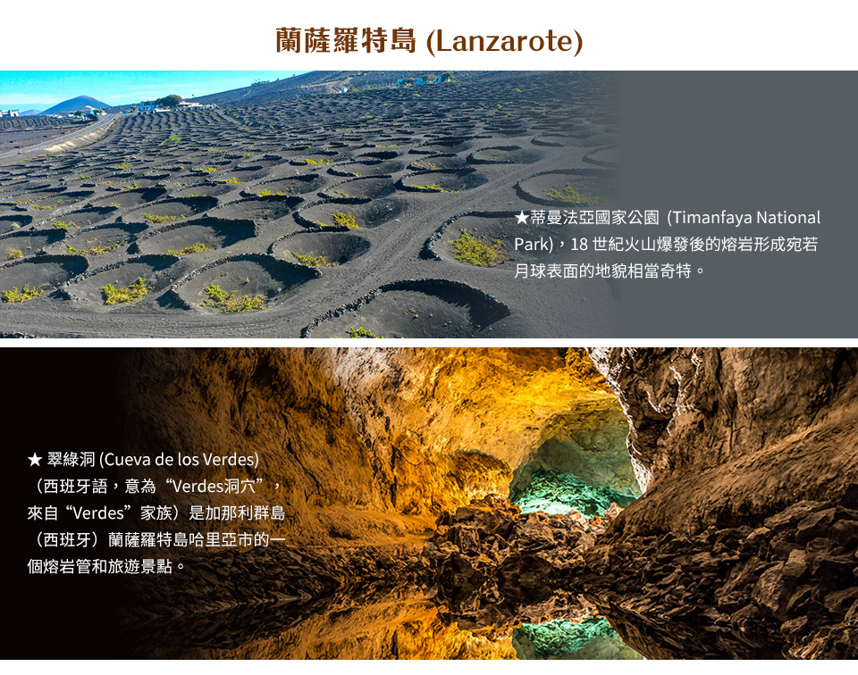 ●時光密道,洛斯佛德斯洞穴 ( Cueva de los Verdes ):這是一場通往地心的夢幻冒險。身處科羅納火山噴發留下的巨型管道,長達八公里的地底迷宮充滿了神話色彩。漫步在挑高五十公尺的宏偉拱頂下,層疊的畫廊與幽靜的地底潟湖倒映著迷離的光影。這座隱匿於荒野之下的自然神殿,靜謐而深邃,訴說著萬年前熔岩奔湧的狂暴歷史。