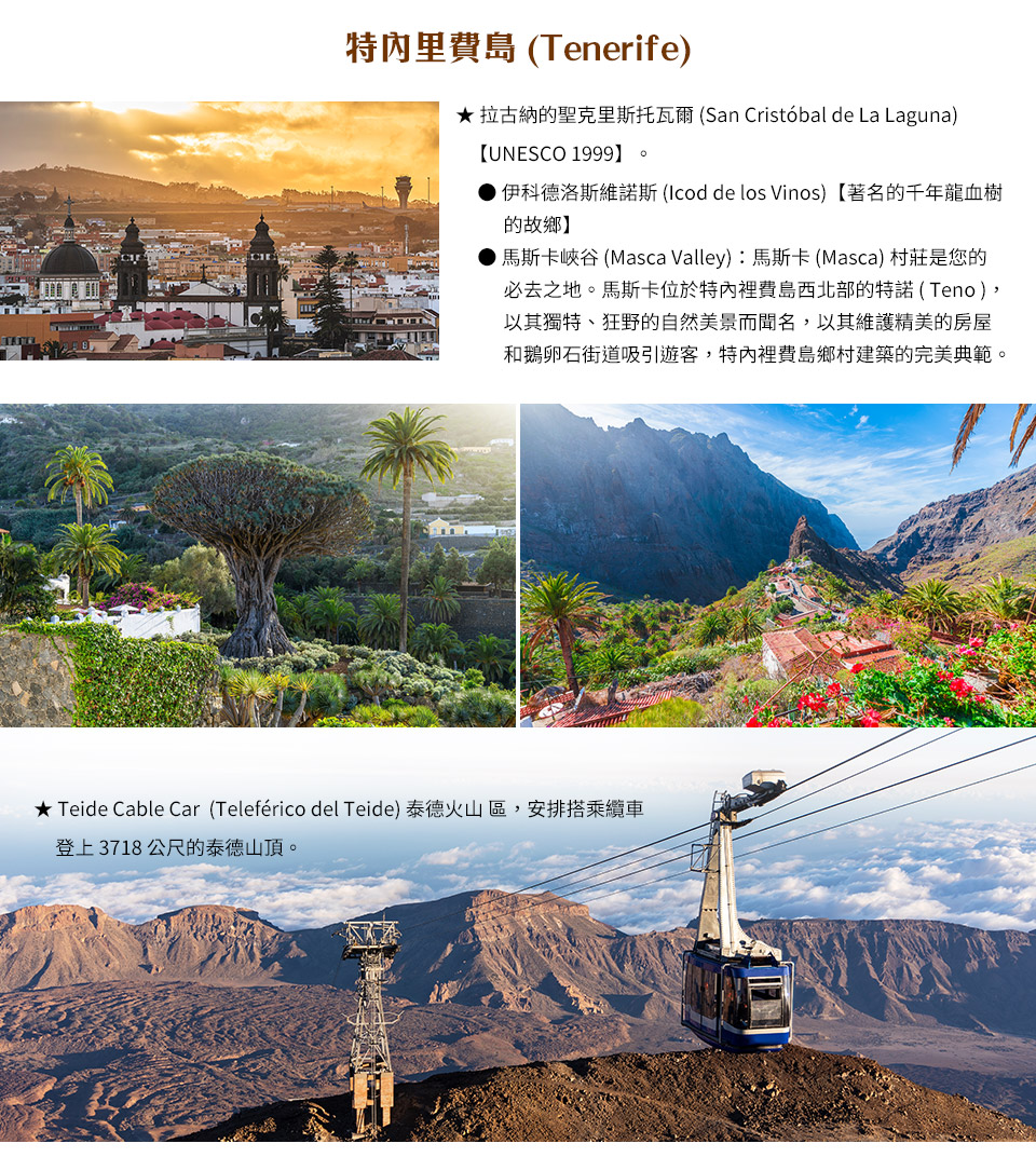 ●飛越顛峰,泰德峰纜車 ( Teleférico del Teide ):搭乘纜車,就像是進行一場通往異世界的垂直旅行。隨著海拔迅速攀升,腳下的地貌從綠意轉為粗獷的赭紅。當抵達3,550米的 La Rambleta 站時,您已身處於大地的金字塔尖,俯瞰那像是上帝隨手撒下的荒涼美學。