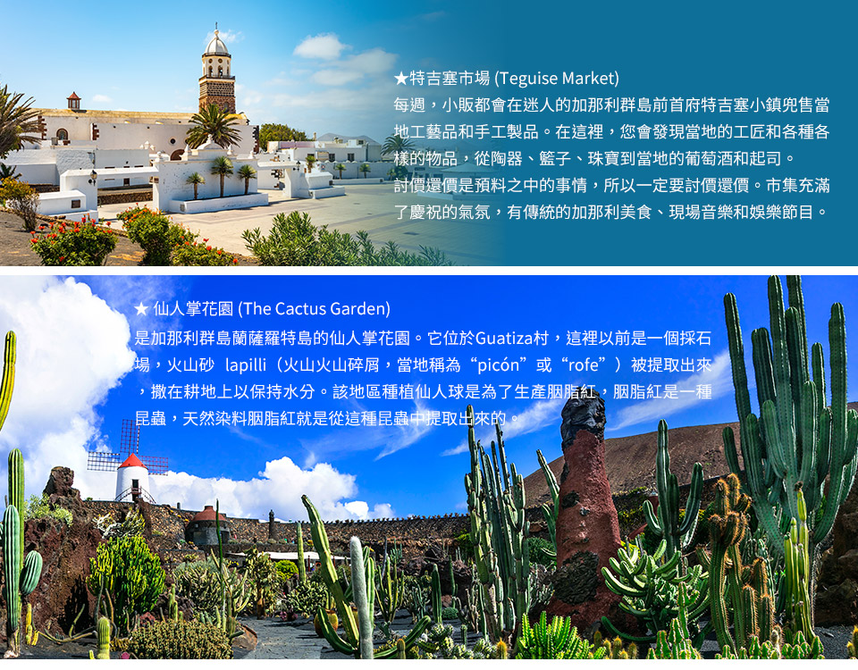 ●大地刺青,仙人掌花園 ( The Cactus Garden ):在廢棄採石場的荒涼背景下,藝術家曼里克(César Manrique)化腐朽為神奇,將滿地的黑色火山砂轉化為一座翠綠的植物迷宮。成千上萬株形態奇異的仙人掌,如同大地的天然雕塑,在陽光下昂首挺拔。這裡曾是繁衍胭脂紅蟲的搖籃,如今則是火山灰燼中綻放出的生命奇蹟,展現了人與自然和諧共生的極致美學。