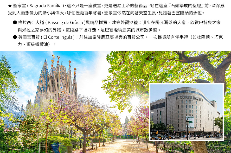 ●英國宮百貨 ( El Corte Inglés ):前往加泰隆尼亞廣場旁的百貨公司,一次掃貨所有伴手禮(如杜隆糖、巧克力、頂級橄欖油)。