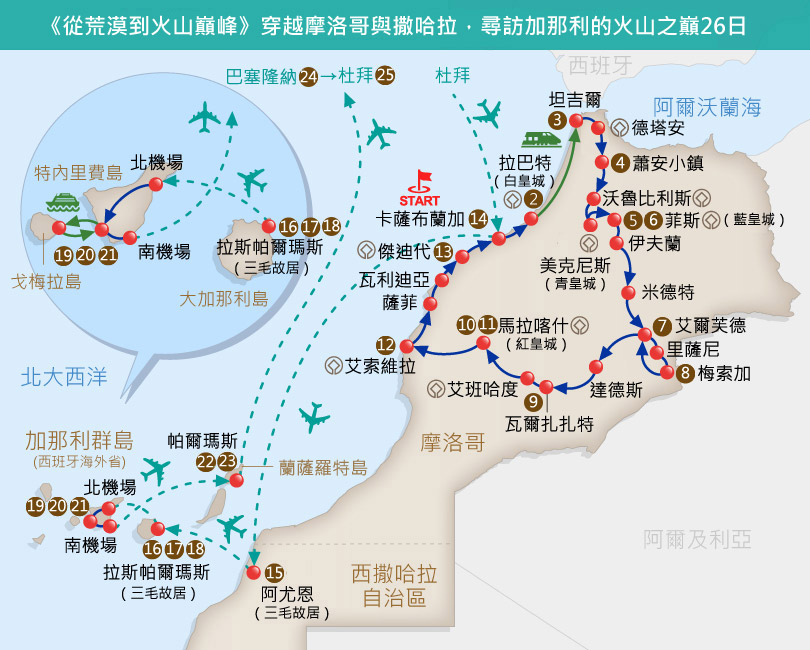帶著一顆渴望流浪的心踏上旅程,飛往北非的花園~摩洛哥。我們將在這個非洲最歐化的國家,展開一段時空交錯、多彩迷離、充滿傳奇氛圍的摩洛哥.西撒哈拉.加那利群島.三毛足跡之旅。