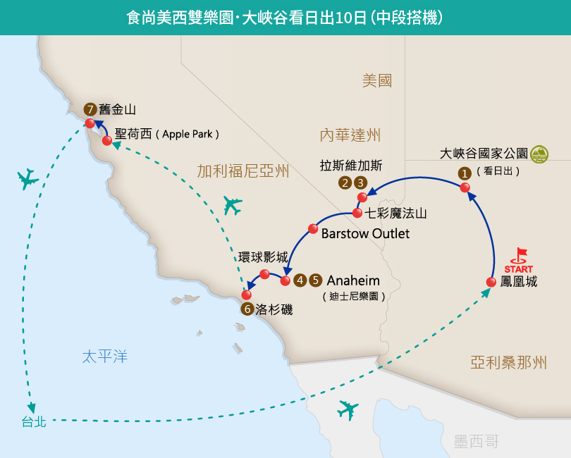 理想旅遊行程列印-食尚美西雙樂園.大峽谷看日出10日(中段搭機)一場夢想實現的美西之旅!我們從大峽谷看日出的感動開場,接著轉進沙漠奇蹟拉斯維加斯,並特別安排中段搭機輕鬆飛往舊金山。行程重頭戲是食尚美西雙樂園的狂歡:在洛杉磯迪士尼樂園重溫童真,於環球影城變身電影主角。從七彩魔法山到矽谷科技園區,再到舊金山金門大橋,這趟10日旅程不僅滿足了大人對美景與美食的追求,更為孩子們留下了無價的歡樂回憶。