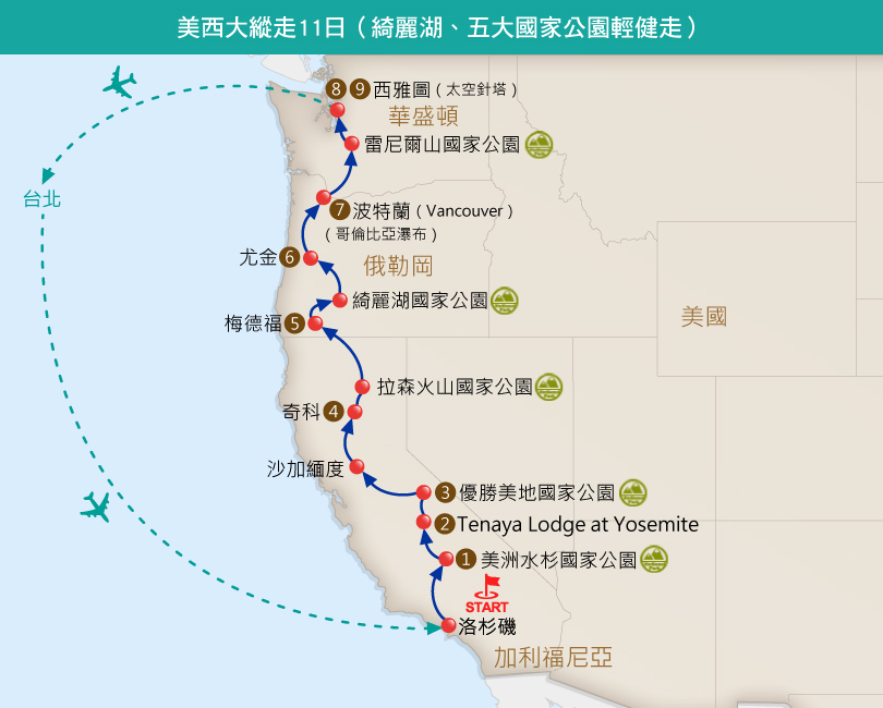 理想旅遊行程列印-美西大縱走11日(綺麗湖、五大國家公園輕健走)一趟征服美西五大國家公園的壯麗旅程!11日大縱走,我們將帶您探訪世界最大的美洲水杉、優勝美地的宏偉峭壁、拉森火山的地熱奇觀、美國最深最藍的綺麗湖,以及雷尼爾山的磅礴冰川。從洛杉磯到西雅圖,用輕健行的方式,深度體驗美國西海岸的自然精華。