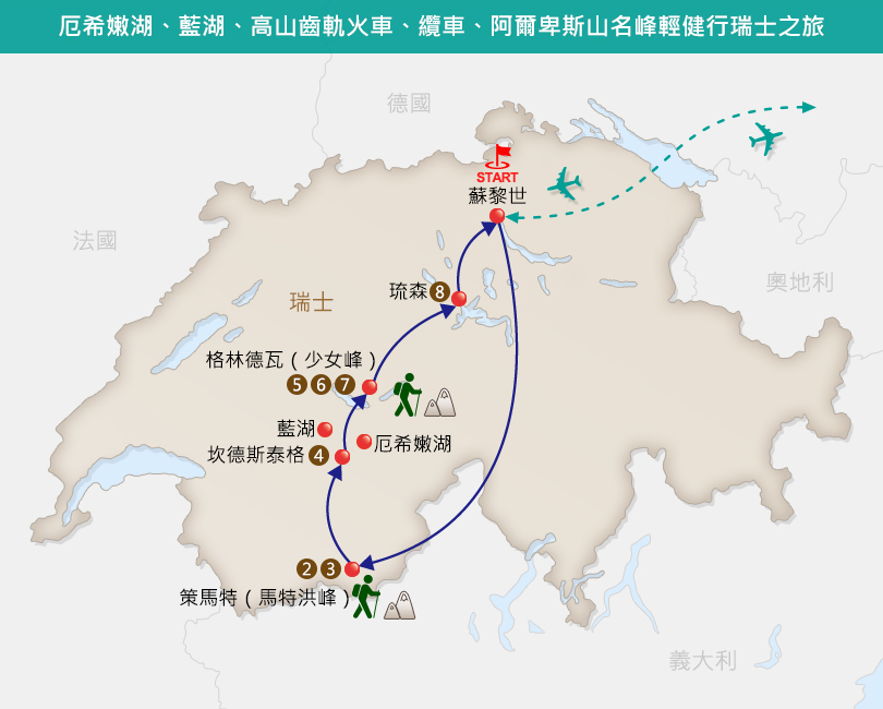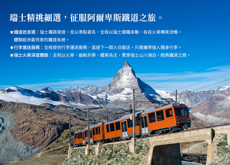 3. 因全程是以搭乘火車方式遊覽瑞士,故僅限少人數(20位以下)出團。