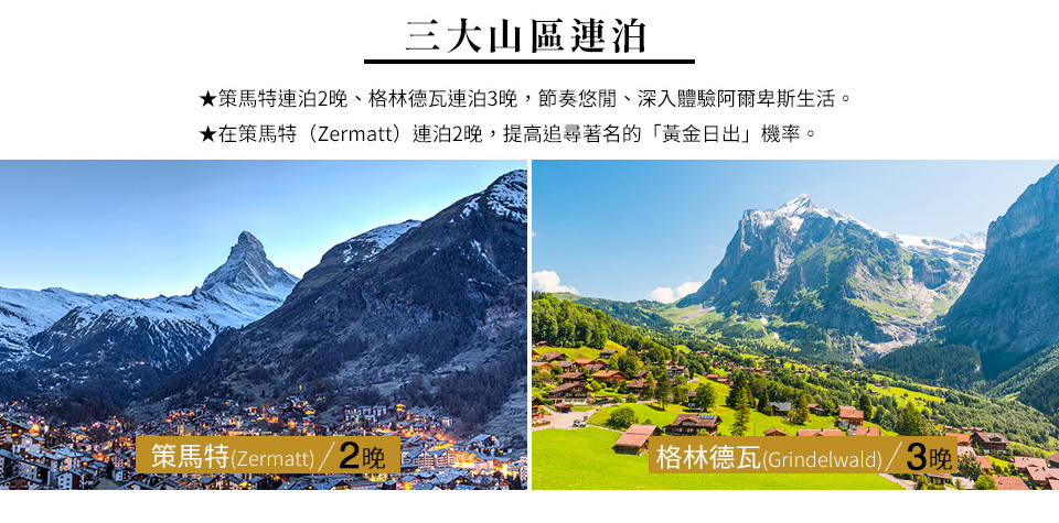 3. 山區名城連泊深度遊:策馬特連泊2晚、格林德瓦連泊3晚。