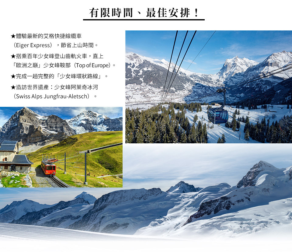 3. 瑞士山區飯店住宿條件有限,多以三星級飯店為主,內裝設施較為簡樸,敬請見諒。