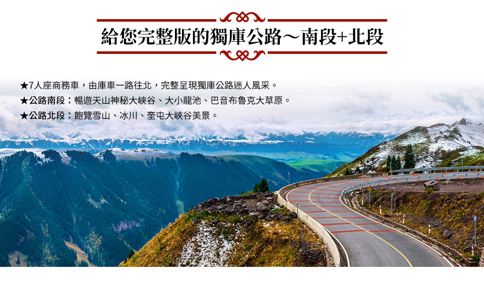 巴音布魯克(區間車 天鵝湖、九曲十八彎:電瓶車)-獨庫公路北段:雪山、冰川、獨庫公路紀念碑、奎屯大峽谷(獨子山)-奎屯(今日車程約6小時-7人商務車4人1部)