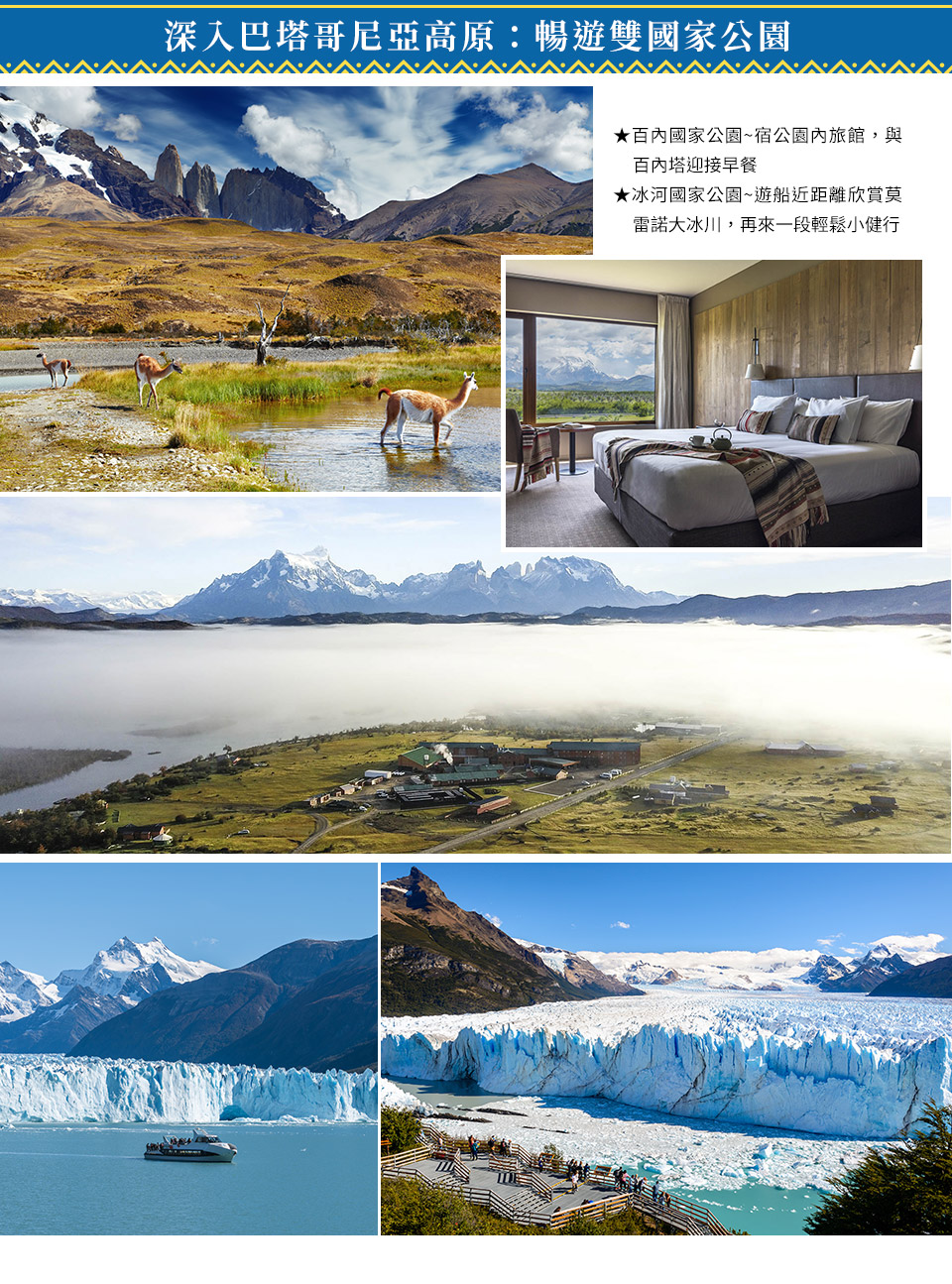 穿越智利、阿根廷兩國邊界,抵達阿根廷南部巴塔哥尼亞高原上的聖卡拉法特(El Calafate),這兒終年低溫、颳大風,有「風城」封號。這兒最著名的景點就是「冰河國家公園」。特別選用當地最好的飯店,在寒冷多風的巴塔哥尼亞高原上,這幢美麗靜謐的度假別墅顯得特別溫馨!飯店的客房溫暖舒適,休閒設施齊全,我們將在此連泊2晚,明天一早就可以直接遊覽冰河國家公園,玩透透之後就可以回飯店休息,安排超貼心!