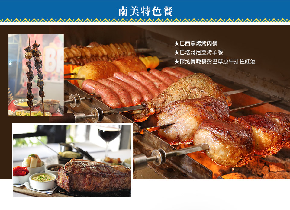中午※特別安排★巴西窯烤餐,服務生會拿各式各樣烤肉串到桌邊服務,有菲力、肋眼、還有牛峰肉,另外還有自助式沙拉吧。這是熱情的南美初次印象,愉快的用餐環境,也感受到滿滿的拉美風情。