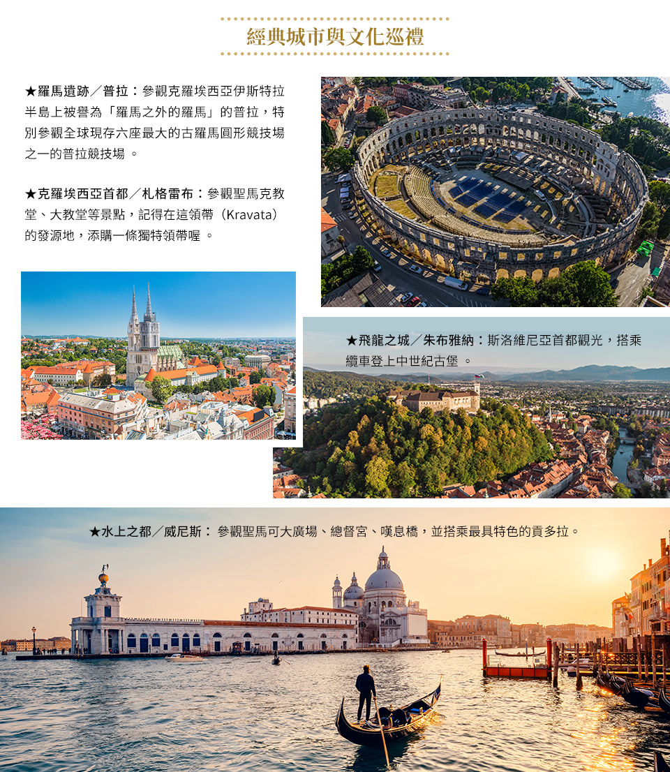 斯洛凡尼亞首都~朱布亞那,1895年毀於地震,重建工作由當地建築大師普雷契尼克主導,融合多元建築風格彷彿個人作品博覽會,贏得「小布拉格」美稱。今天將參觀▲市政廳、綠頂雙塔的▲聖尼古拉教堂、希臘式列柱長廊的▲中央市場、2座新橋夾舊橋的▲三重橋,以及橫跨朱布亞那河的▲飛龍橋等精彩景點,還將搭纜車直上高踞80公尺山崖的中世紀★古堡(GRAD)。