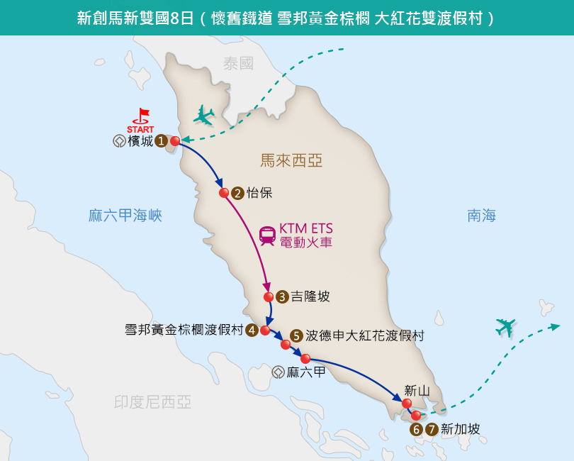 新創馬新雙國8日(懷舊鐵道.黃金棕櫚樹.大紅花雙渡假村)