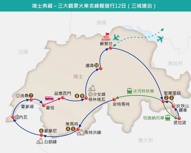 瑞士典藏~三大觀景火車名峰輕健行12日(三城連泊)