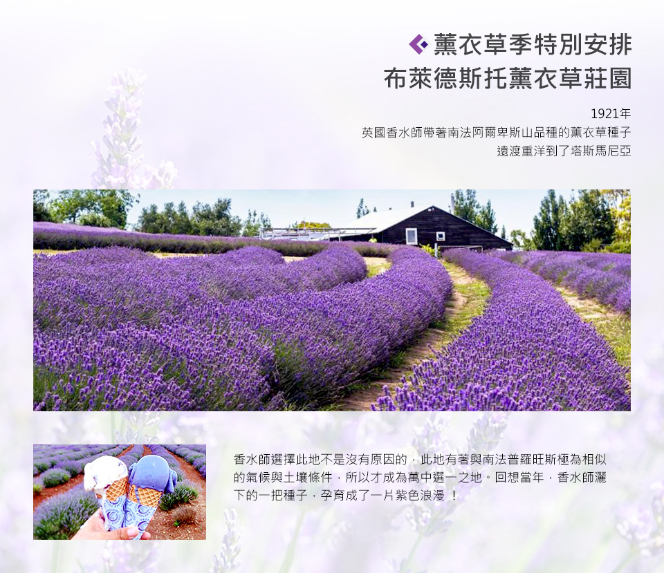 為什麼薰衣草會飛越半個地球,從南法飛到塔斯馬尼亞?話說1921年離鄉背井的英國香水師丹尼,來到氣候土壤條件與普羅旺斯極為相似的塔斯馬尼亞,種下來自南法阿爾卑斯山品種薰衣草,開啟塔斯馬尼亞薰衣草經濟鏈-各種薰衣草精油、乳液, 還有人氣榜TOP 1的薰衣草小熊BOBI。我們為貴賓※特別安排在花田深處,品嚐每人一道薰衣草香氛咖啡或霜淇淋!