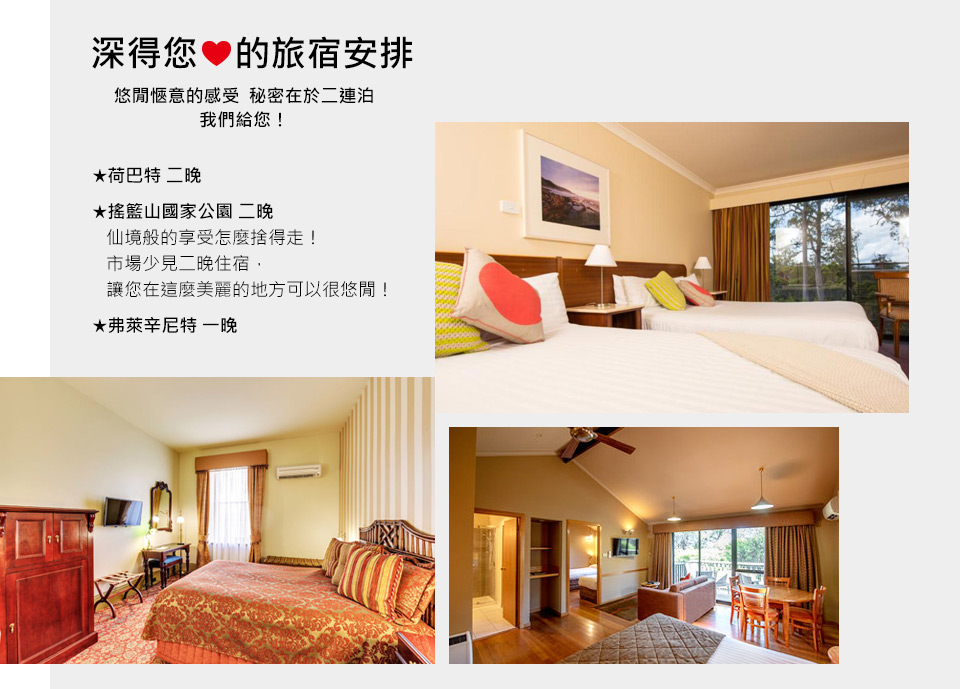 搖籃山國家公園園區內飯店以難訂著稱,更何況連泊!但我們堅持讓您在國家公園內連泊2晚,更加悠閒從容地融入原始古澳洲時期的自然景致。入夜後若當地特有動物來訪,莫驚莫慌莫害怕,請享受難得的大自然體驗。