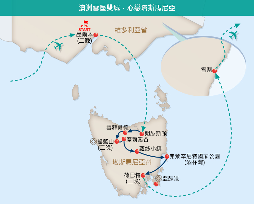 每一趟旅行,都有屬於自己的態度。而這趟旅程的態度,就是滿懷期待地航向東澳,進行一場五感大滿足的身心靈療癒之旅!準備好了嗎?今晚我們將搭機直飛墨爾本,並夜宿機上於隔日抵達。