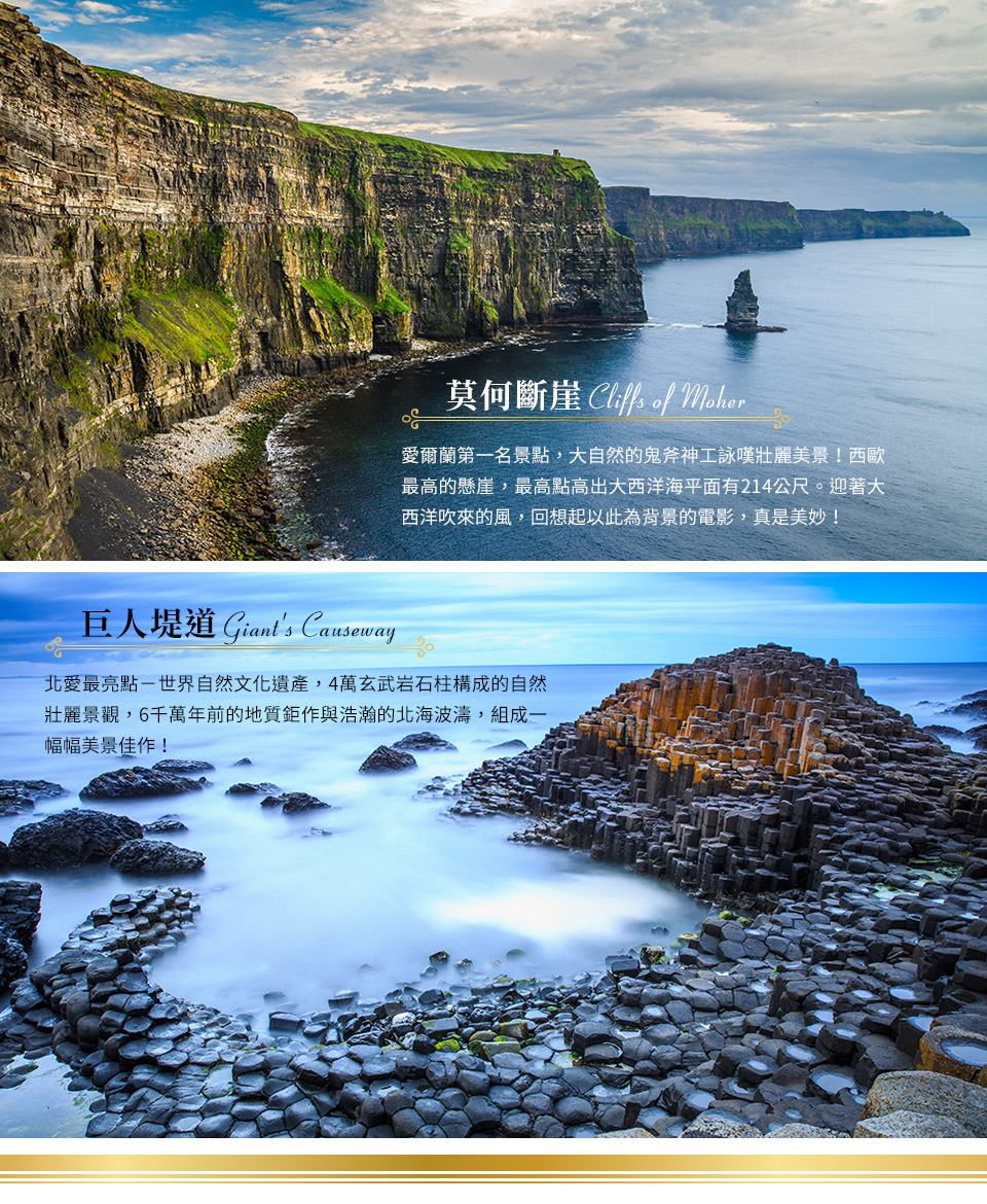 ●莫何斷崖(Cliffs of Moher)宛如一列長達8公里、面向大西洋壁立的巨人骨牌,與陰晴難以捉摸的大西洋相對峙,共構這令人屏息的愛爾蘭奇景。懸崖上的歐布萊恩塔,自1835年矗立至今,與浩瀚大西洋面垂直距離214公尺,有懼高症、膽怯者與體重過輕者切勿靠太近;尖銳的Branaunmore sea stack彷彿巨人磨利的匕首,正準備割裂藍色大西洋,景致備顯驚心動魄!遊客中心直接鑿山崖而成,別開生面,頗具特色。