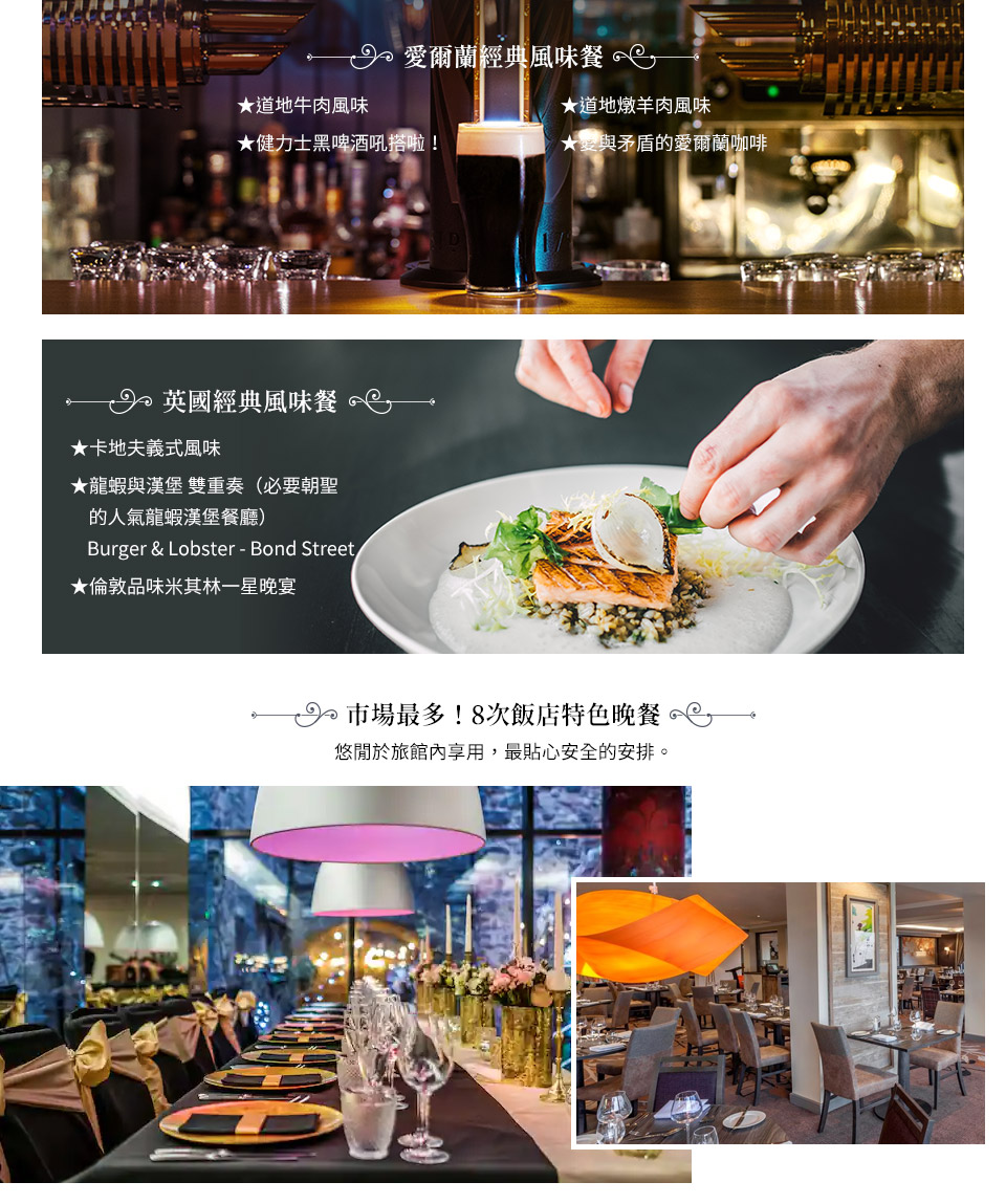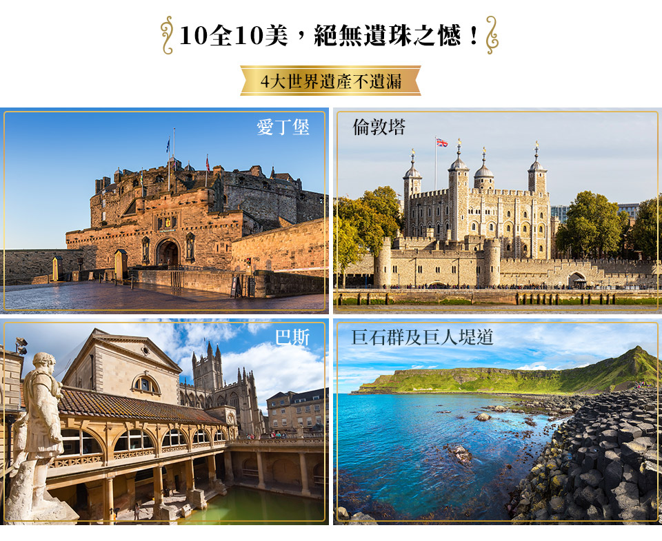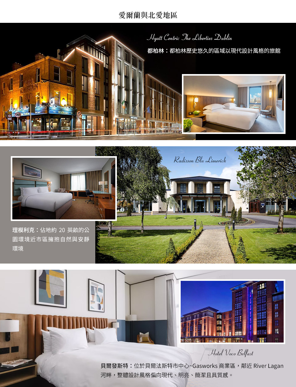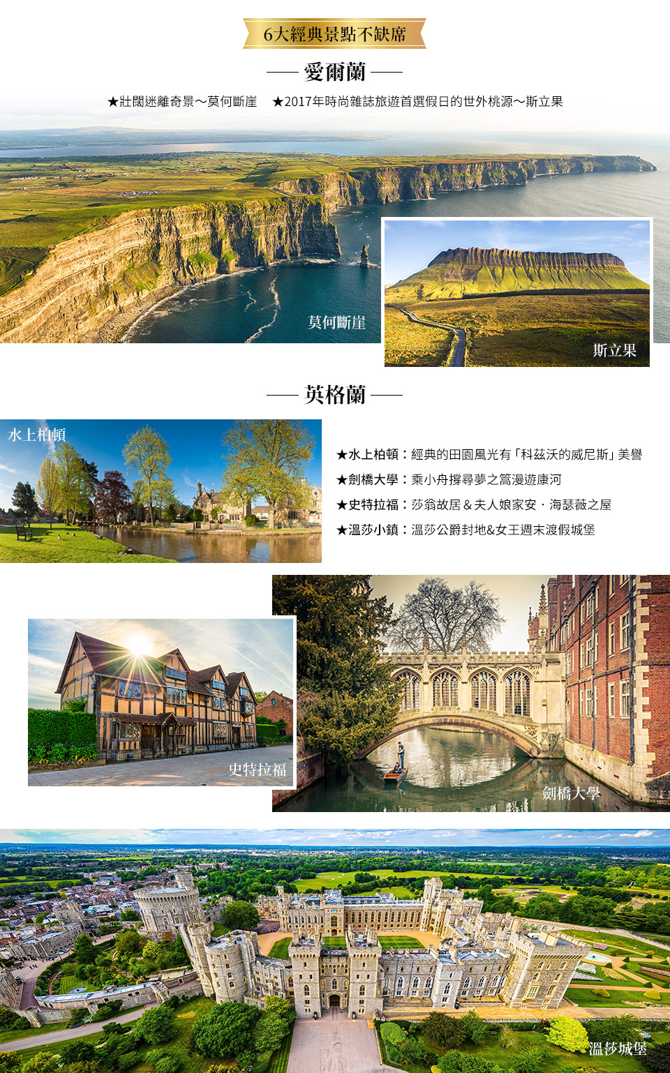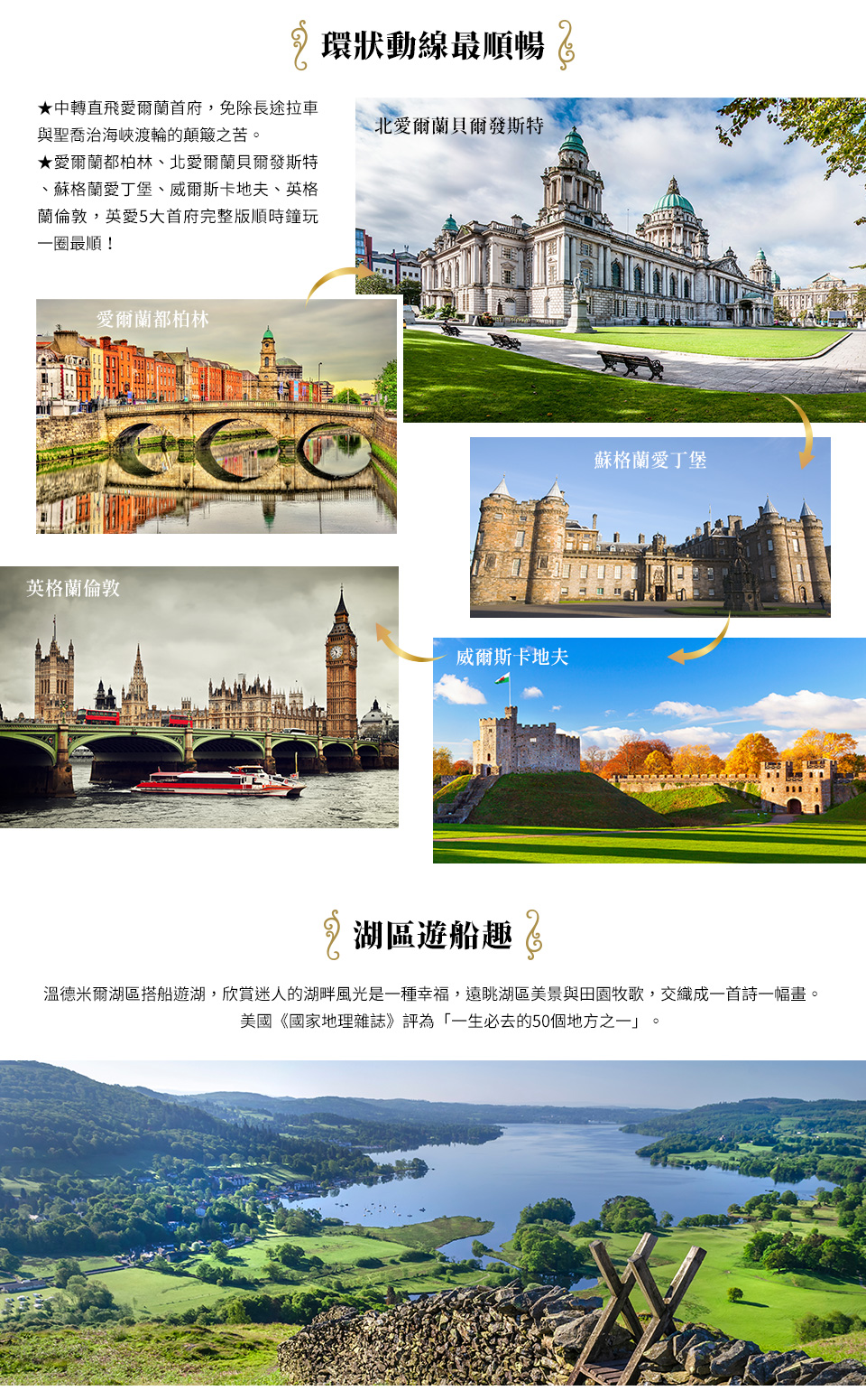 此行從愛爾蘭開始,採順時鐘方式將英愛經典名城勝景一路串起,輕鬆、舒適又有效率,免除長途拉車與聖喬治海峽渡輪的顛簸之苦,絕對是專業玩家的絕佳安排!