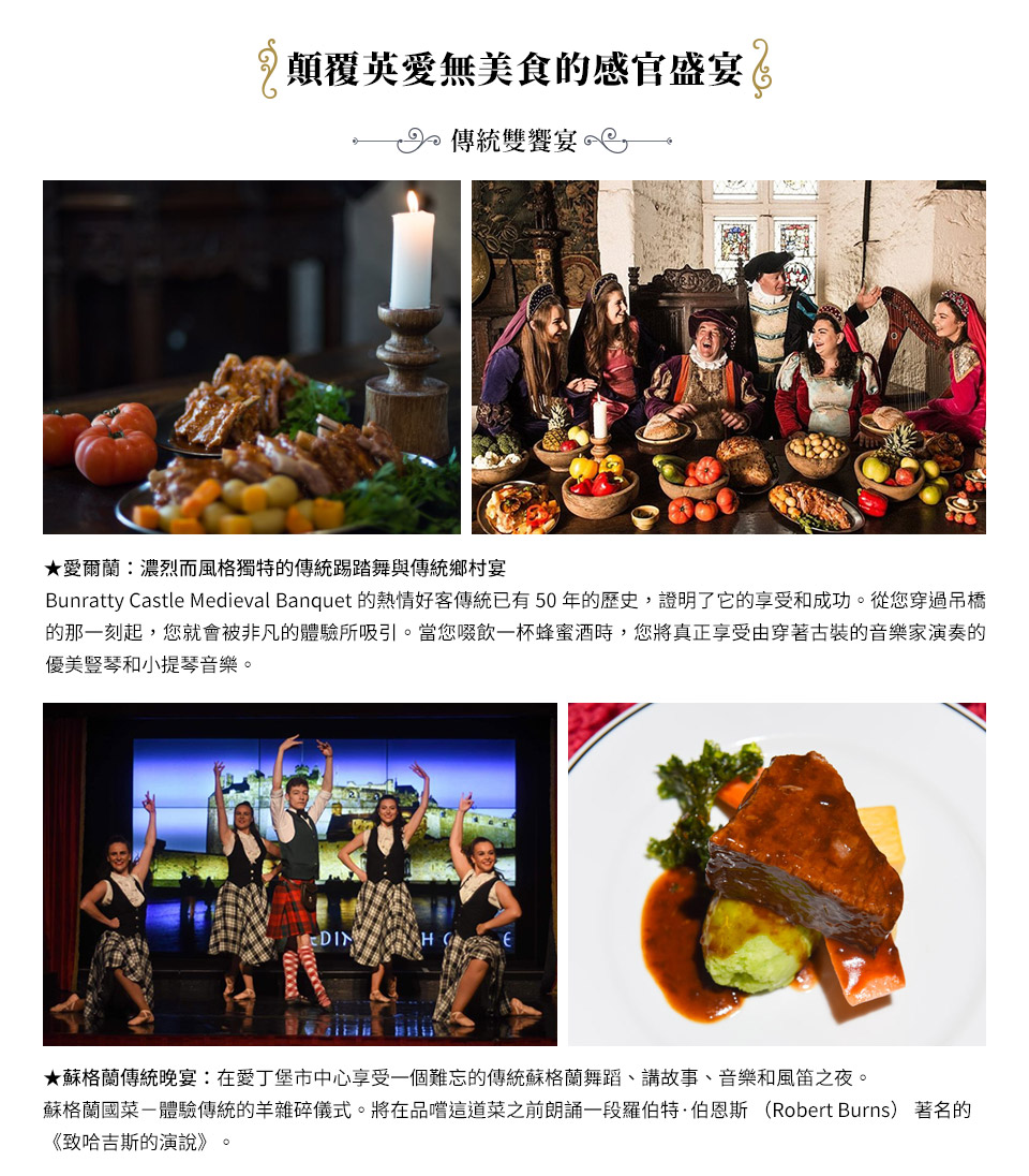 在古意盎然的城堡裡享用蘇格蘭傳統晚宴,表演廳彷彿一座歡樂的帳棚,今晚的表演者都穿著傳統蘇格蘭格子呢料服飾;男歌手以迷人歌聲唱著古老的民謠,年輕女孩歡快地跳著高地傳統舞蹈,還會請各國旅客同樂;技藝精湛的小提琴手與手風琴樂師,演奏傳統歌謠與舞曲,旋律優美醉人。晚宴餐點豐盛美味,蘇格蘭名點「羊肉雜碎布丁」不妨試試。