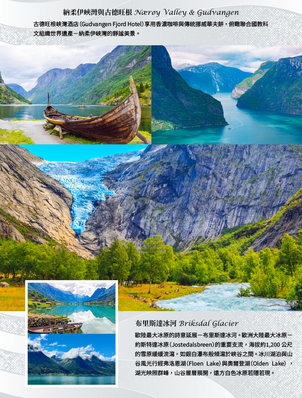 進入冰河雕刻而成的崎嶇懸崖與峭壁。抵達古德旺根後,將在古德旺根峽灣酒店享用香濃咖啡與傳統挪威華夫餅,俯瞰聯合國教科文組織世界遺產—納柔伊峽灣的靜謐美景。