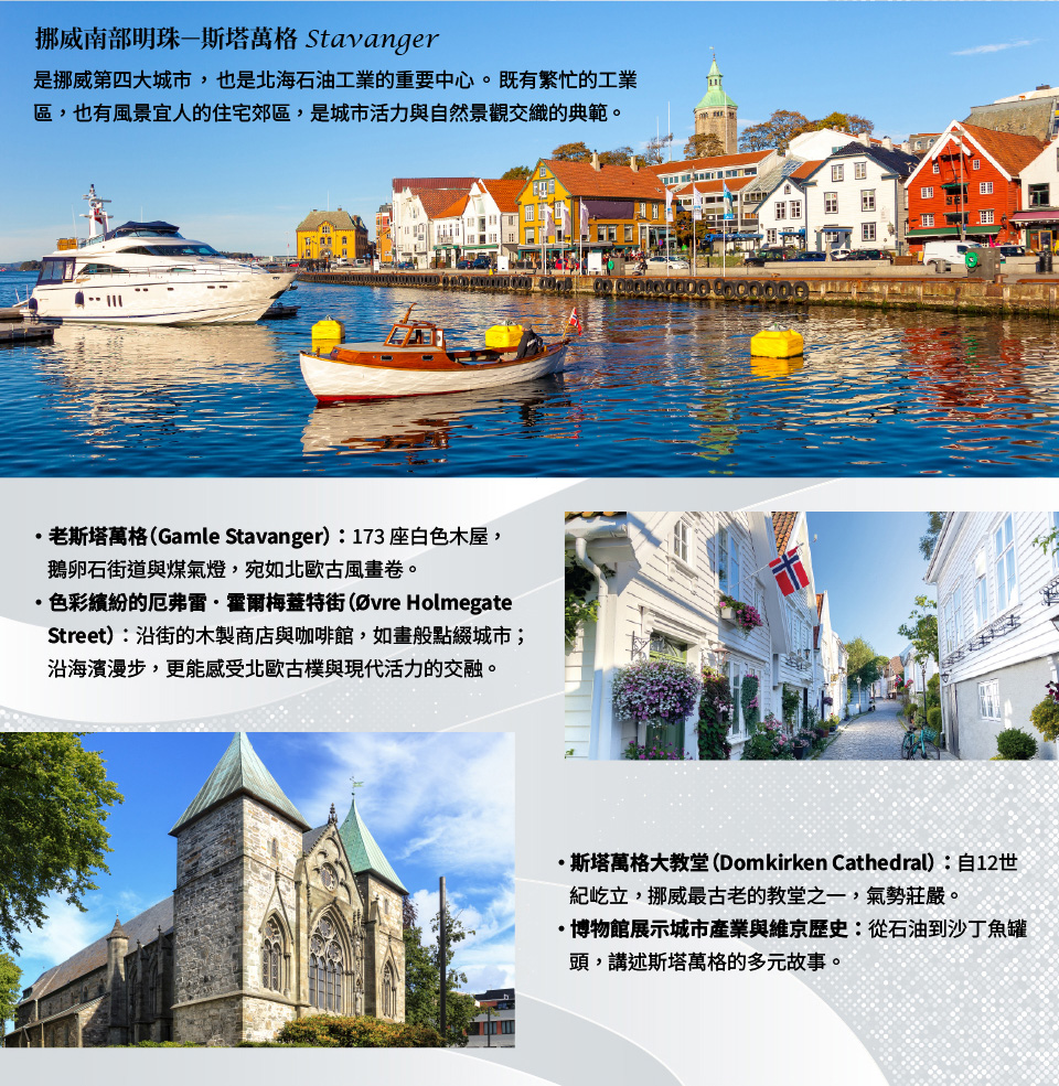 是挪威能源之都,擁有保存完好的歷史城區,四周環繞峽灣、山脈與沙灘。城市因北海石油與工業發展而崛起,但卻保有迷人自然景觀與多元活力。