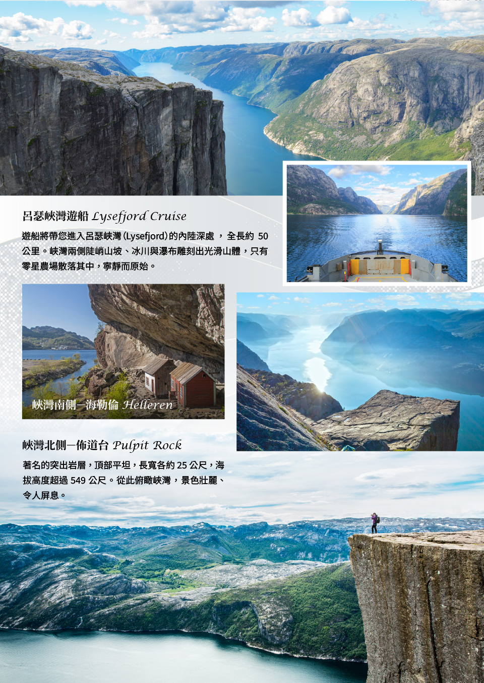 於峽灣北側航行時,將從船上仰望世界知名的佈道台岩層。這座平坦岩台長寬各約 25 公尺,海拔超過 549 公尺,自峽灣水面向上望去,更顯氣勢磅礡,令人屏息讚嘆。