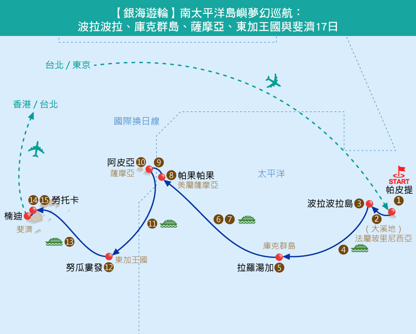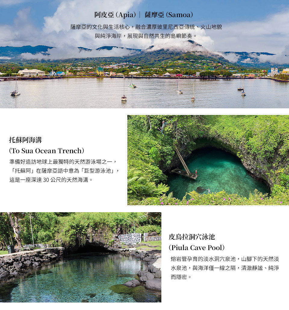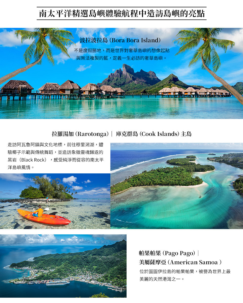 那些難以自行企及、卻值得一生走一回的島嶼夢境— 從波拉波拉出發,途經庫克群島、美屬薩摩亞、薩摩亞、東加王國, 最終停泊於斐濟— 一段只屬於南太平洋的長弧航程,在心中靜靜排列,成為時間無法帶走的風景。