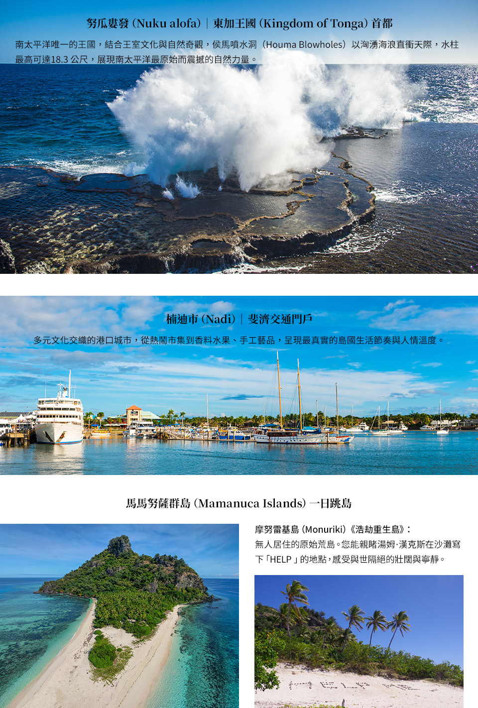 1.必訪指標島嶼 摩努雷基島Monuriki 島 (浩劫重生島):無人居住的原始荒島。您能親睹湯姆·漢克斯在沙灘寫下 "HELP" 的地點,感受與世隔絕的壯闊與寧靜。